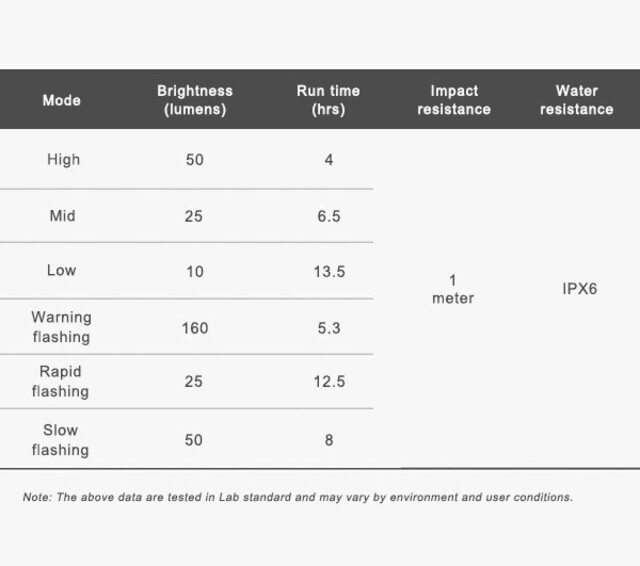 Vészvillogó mód: 160 lumen, 5.3 óra